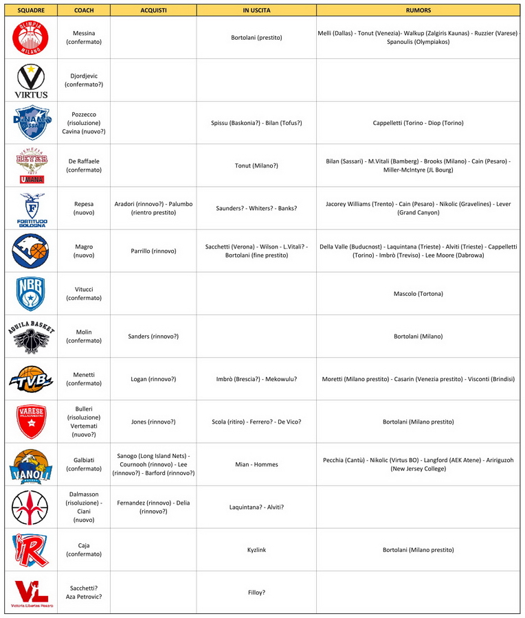 Sono gli allenatori ad essere i più ricercati in questo particolare momento di inizio mercato. Tante risoluzioni, rinnovi e nuovi contratti che riguardano i profili tecnici sulle panchine di serie A. Questa settimana hanno risolto il loro contratto Pozzecco a Sassari e Dalmasson a Trieste. Ufficiale il sostituto di quest’ultimo sulla panchina triestina, sarà il suo vice Ciani. Ancora senza un nuovo coach Varese e Pesaro. Sul fronte dei giocatori si iniziano a intavolare trattative ma nessun colpo è ancora andato a segno.