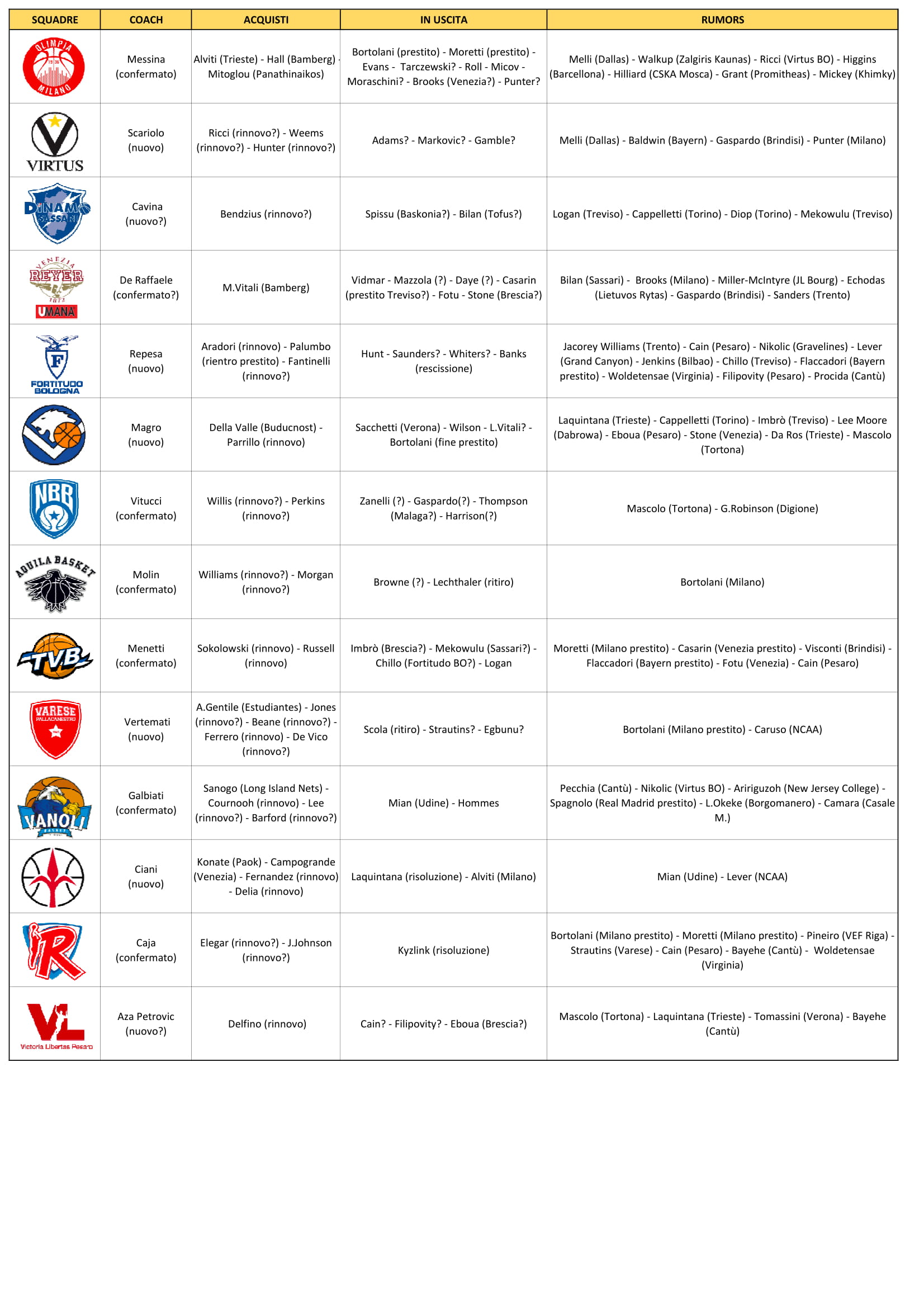 Altri rumors danno per avviata la trattativa con Giampaolo Ricci, capitano della Virtus Blogna tricolore, che sta trattando il rinnovo con le V nere, ma l’Olimpia avrebbe fatto un’offerta molto importante, che sta ingolosendo l’ala forte italiana classe 1990.