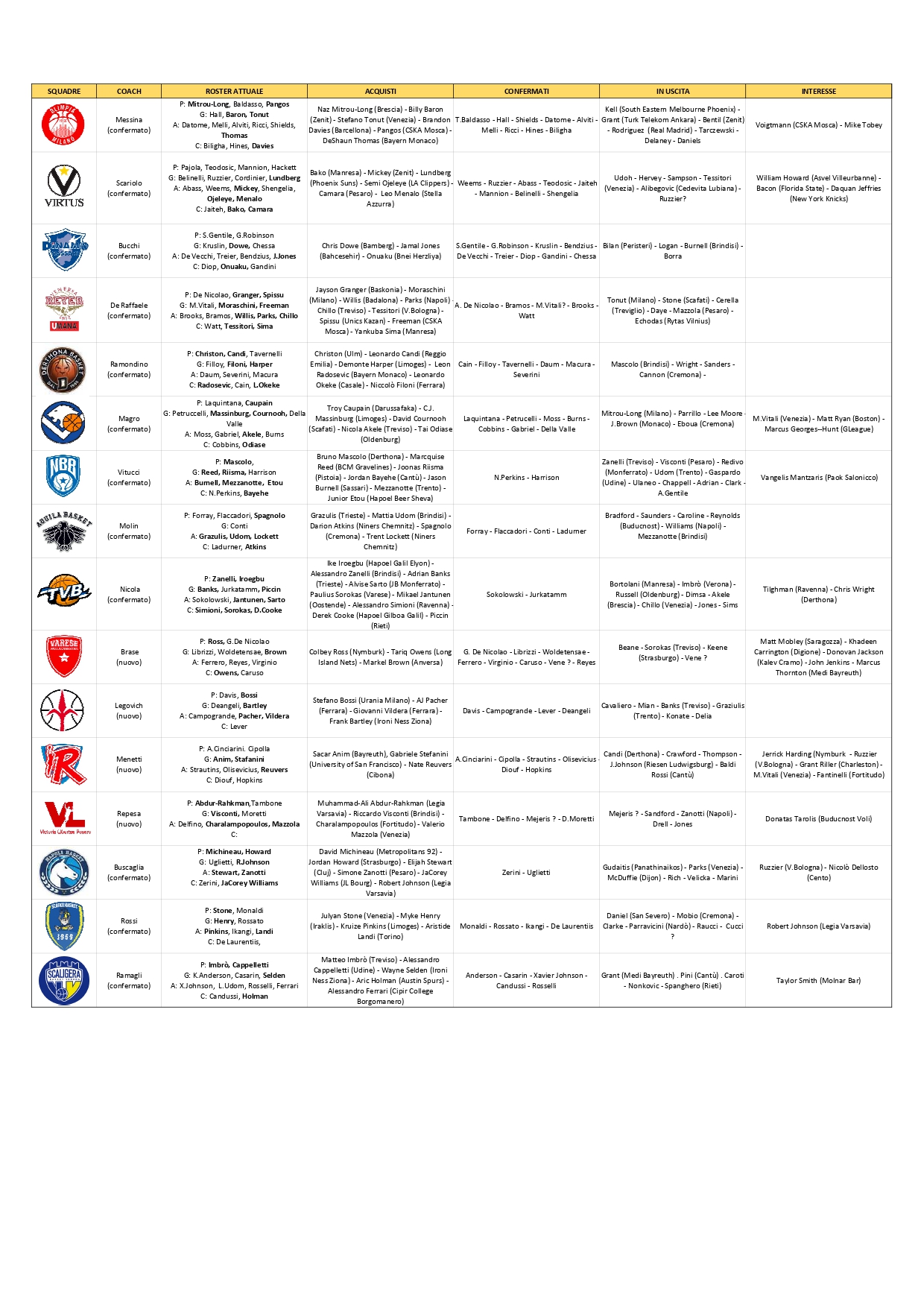 Nuovi acquisti, cessioni, conferme, giocatori di interesse e nuova composizione dei roster per la stagione entrante.