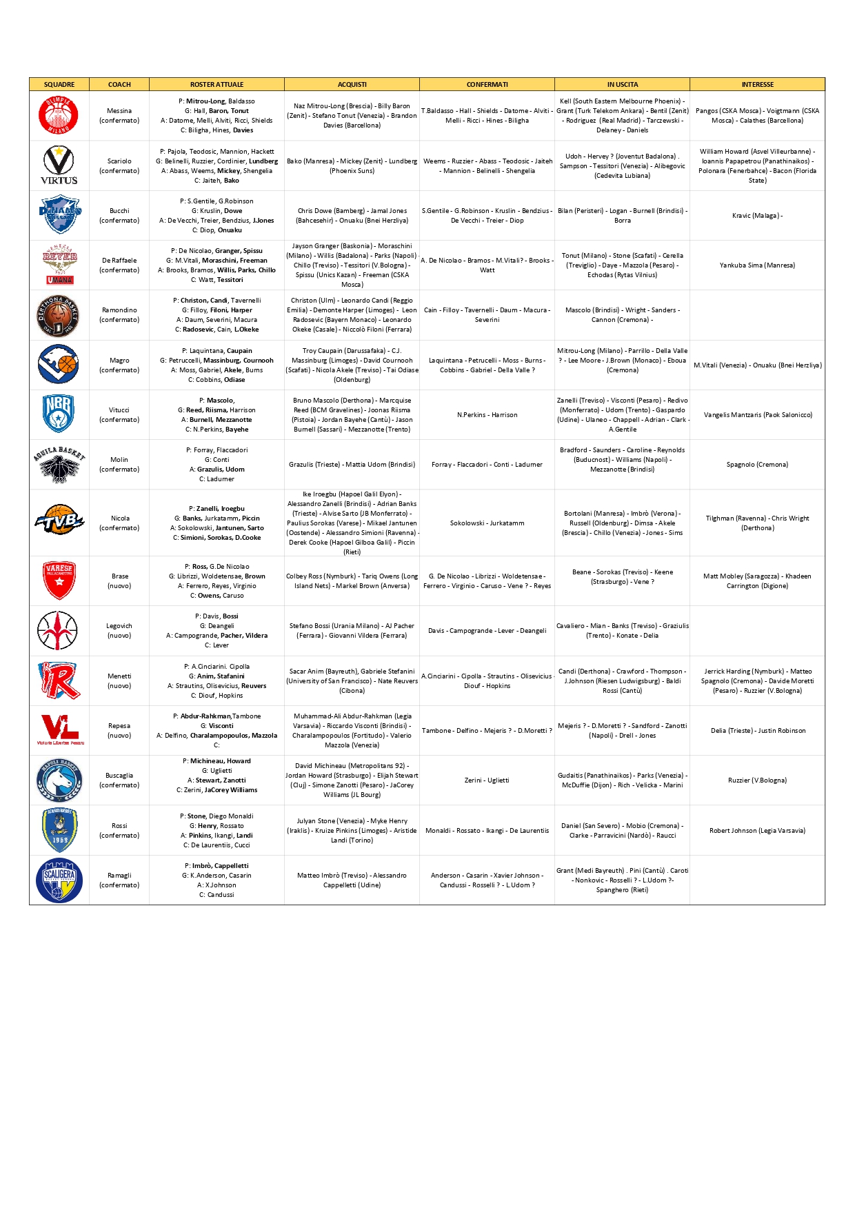 Nuovi acquisti, cessioni, conferme, giocatori di interesse e nuova composizione dei roster per la stagione entrante.
